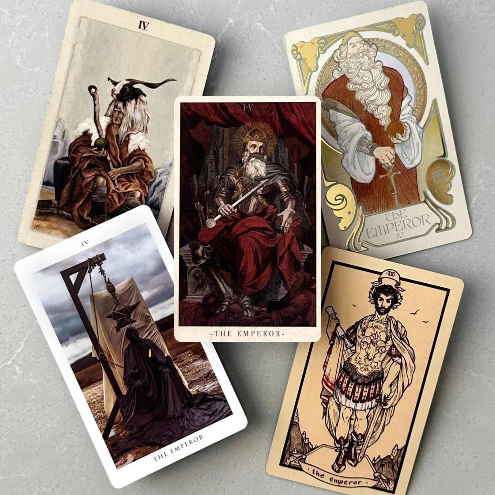 The Emperor. Clockwise from top left: the Pagan Otherworlds Tarot by Uusi (Uusi.us), the Terra Volatile by Credo quia Absurdum (TerraVolatile.com), the Ethereal Visions Illuminated Tarot by Matt Hughes (US Game Systems, Inc.), the Fyodor Pavlov Tarot by Fyodor Pavlov (US Game Systems, Inc.), and the Somnia Tarot by Nicolas Bruno (SomniaTarot.com).