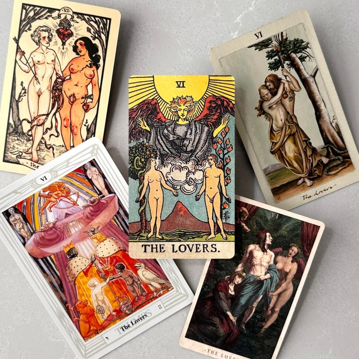 VI. The Lovers. Clockwise from top left: the Fyodor Pavlov Tarot by Fyodor Pavlov (U.S. Games Systems, Inc.), the Smith-Waite® Tarot (Borderless Edition) by Arthur E. Waite and Pamela Colman Smith (U.S. Games Systems, Inc.), the Pagan Otherworlds Tarot by Uusi, the Terra Volatile Tarot by Credo quia Absurdum, and the Aleister Crowley Thoth Tarot by Aleister Crowley and Lady Frieda Harris (U.S. Games Systems, Inc.).